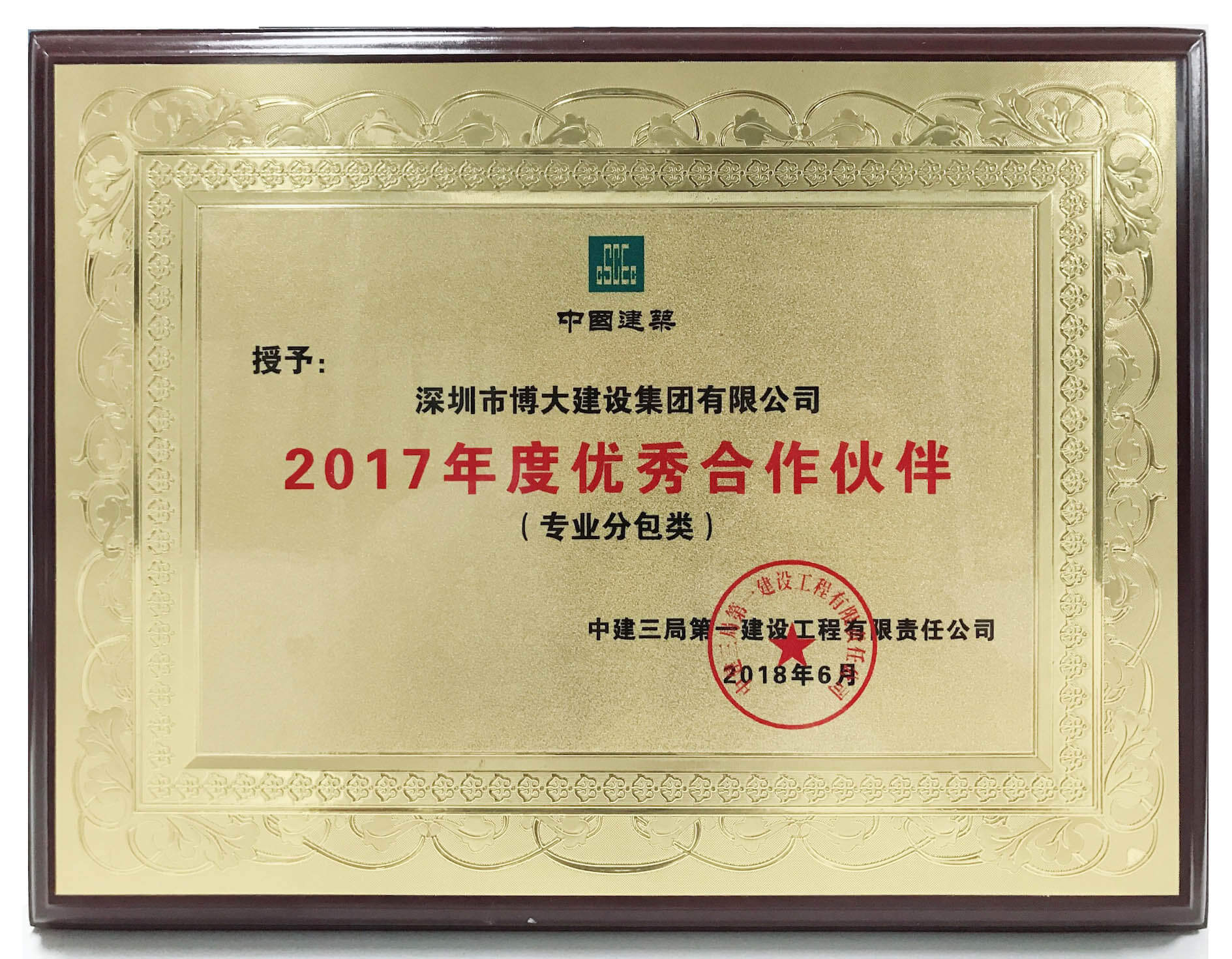 在過(guò)去的一年里,憑借“讓客戶當(dāng)家作主”、“讓客戶有幸福感”的服務(wù)理念和“不畏困難敢于挑戰(zhàn)、保證完成任務(wù)”的鐵軍精神,博大建設(shè)集團(tuán)榮獲中建三局第一建設(shè)工程有限公司頒發(fā)的“2017年度優(yōu)秀合作伙伴”榮譽(yù)稱號(hào)。