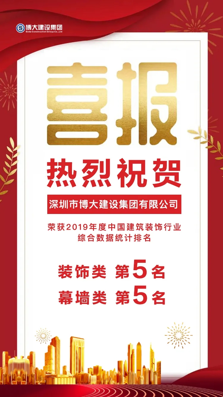 2020年12月23日上午,2019年度中國(guó)建筑裝飾行業(yè)綜合數(shù)據(jù)統(tǒng)計(jì)排名發(fā)布會(huì)在深圳市隆重舉行,深圳市博大建設(shè)集團(tuán)有限公司憑借綜合實(shí)力在裝飾類和幕墻類同步躍居全國(guó)第五名!
